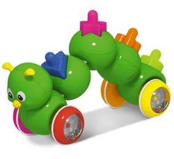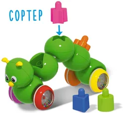 • Размеры игрушки: 30х9х12 см. • Катится при нажатии на корпус. • В комплекте 4 геометрические фигурки, которые нужно вставить в подходящие ячейки на спине у гусенички. • При нажатии на нос,...