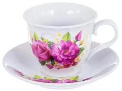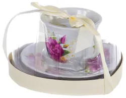 Набор чайный 2 предмета SEE-THROUGH BOX, чашка 250мл и блюдце, серия ФЛОРА, декор РАССВЕТ, прозрачная подарочная упаковка в форме сердца с бантом, ТМ OLAFF, артикул 124-01036