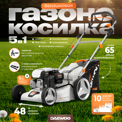 Самоходная бензиновая газонокосилка Daewoo DLM 50SP 5 л.с. является надежной техникой для загородного участка с расширенными функциями:;