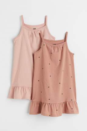 Платья из мягкого трикотажа. В комплекте 2 цвета: розовый и бежевый. Из особенностей: длина до колена, тонкие бретели, снизу — оборка. Без подкладки. Материал: хлопок.