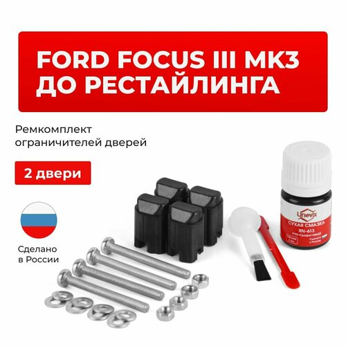 В состав ремкомплекта входят высококачественные фиксаторы, изготовленные из износостойких материалов, что обеспечивает их долговечность и надежную работу. Дополнительно комплект содержит компенсационные пластины в количестве четырех штук, которые способствуют правильной установке и обеспечивают оптимальное положение фиксирующих элементов. Для обеспечения плавного и бесшумного хода дверей в комплект также включена сухая смазка объемом 5 мл, которая предотвращает скрип и снижает трение между подвижными элементами ограничителя Форд Фокус Мк3 3 поколение.